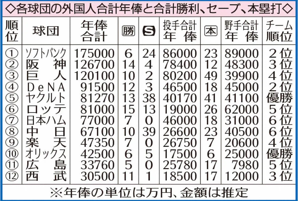 オリックスは外国人が合計6勝、6本塁打で、勝利は12球団で2番目に少なく、本塁打はワースト。シリーズでもワゲスパックが抑えで活躍しただけで、野手は全員登録外と、生え抜きの日本人が奮起した。ただし、外国人の年俸総額は12球団で3番目に少ない4億2500万円。そもそも依存度が低かったオリックスが日本一の座を勝ち取ったのも、今季らしい結末だった。