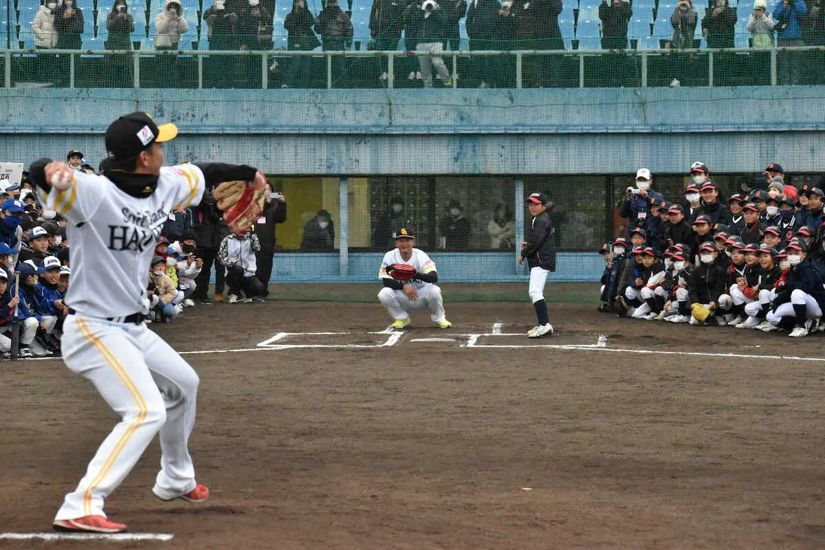 ソフトバンクの東浜巨投手(32)と国内フリーエジェント(FA)権を行使してDeNAからソフトバンクに移籍した嶺井博希捕手(31)が17日、大分・津久見市内で亜大OBによる野球教室に参加した。