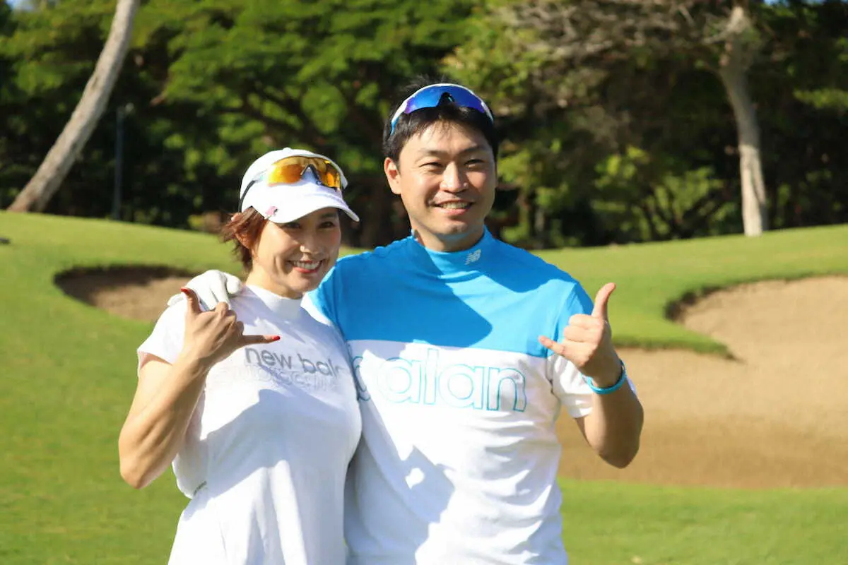 選手会主催ゴルフコンペでヤクルト・青木(右)は佐知夫人とアロハポーズ