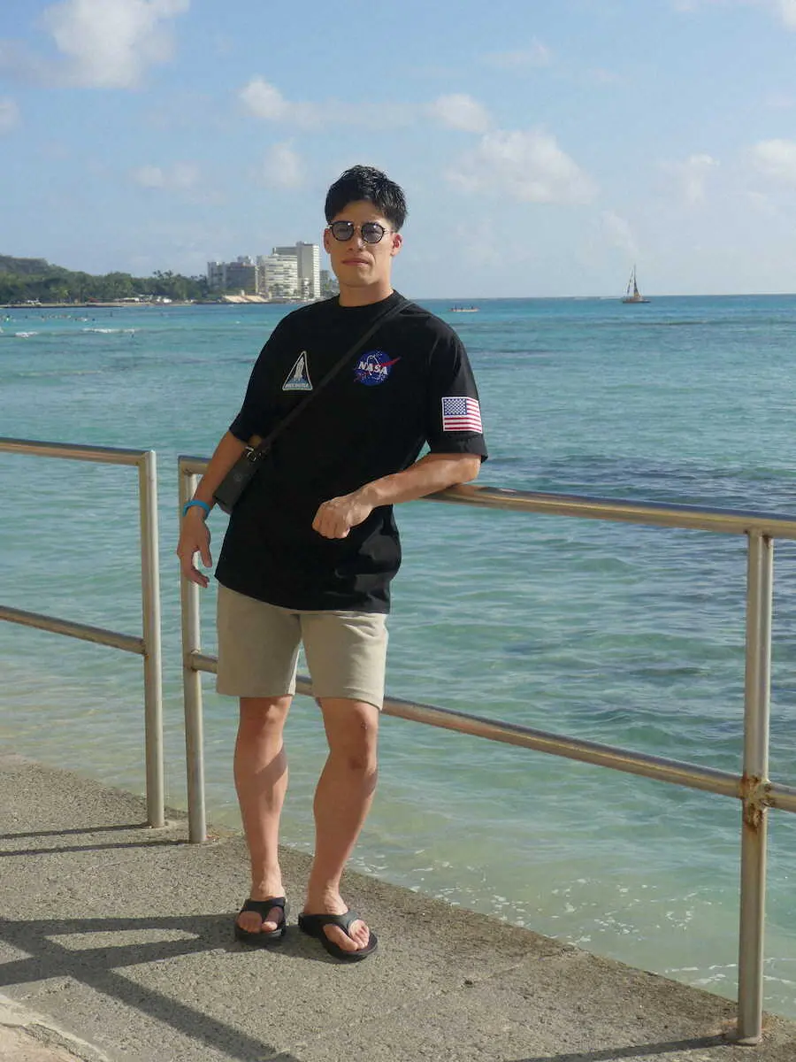 「これはお気に入りのTシャツです。テツ(山田哲人)さんが今年の僕の誕生日(6月12日)にプレゼントしてくれました。バレンシアガ(※1)のTシャツです。左肩にはアメリカの国旗も入っていますし、ハワイにぴったりかなと思って着てきました」