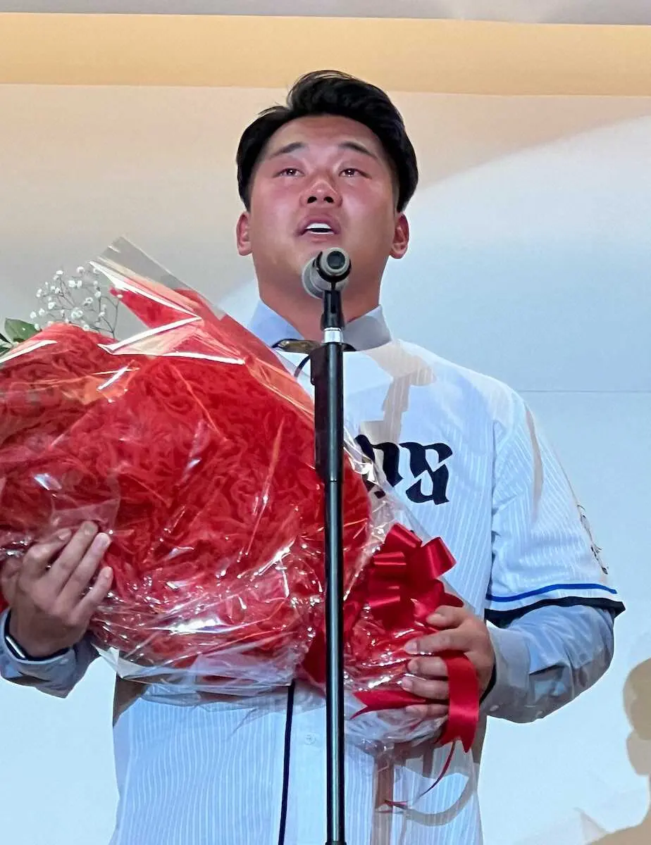 壇上では父・昌久さんが幼少期に家庭の事情で野球を断念した話を口にし「野球をやりたくてもできなかったと言っていましたが…」と言うと声を詰まらせて、涙があふれた。自身には不自由なく野球に専念させてくれたことに感謝し「一日でも感謝の気持ちを忘れないように、グラブには“恩返し”と入れました」と理由を明かした。