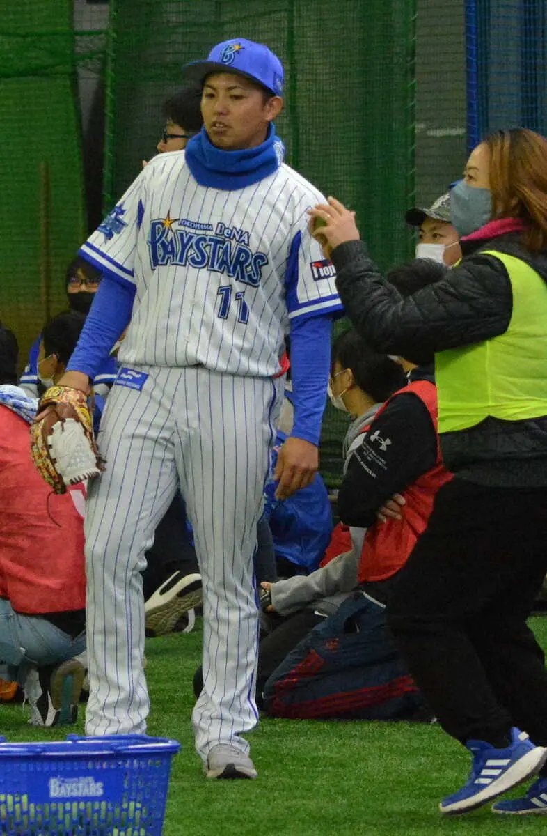 従来の120キロ台よりも遅い、110キロ台のチェンジアップを教わり「笠チェ」と命名。「来年は毎日会うので、より精度を上げられる」。この日は神奈川県横須賀市の球団施設DOCKでファンとの触れ合いイベントに参加し「先発枠を争う相手なので、対抗意識も持たないと」と力を込めた。