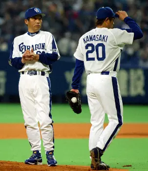 2004年4月2日の広島戦で約4年ぶりの公式戦登板で開幕投手を務めるも5失点KOの川崎憲次郎投手(右)に自ら交代を告げる中日の落合博満監督 Photo by スポニチ 落合博満氏が明かす川崎憲次郎の開幕投手の真相 04年監督デビュー戦で打… ギャラリーで見る この記事のフォト 2022年12月21日の画像一覧 もっと見る 2022年12月21日の画像をもっと見る