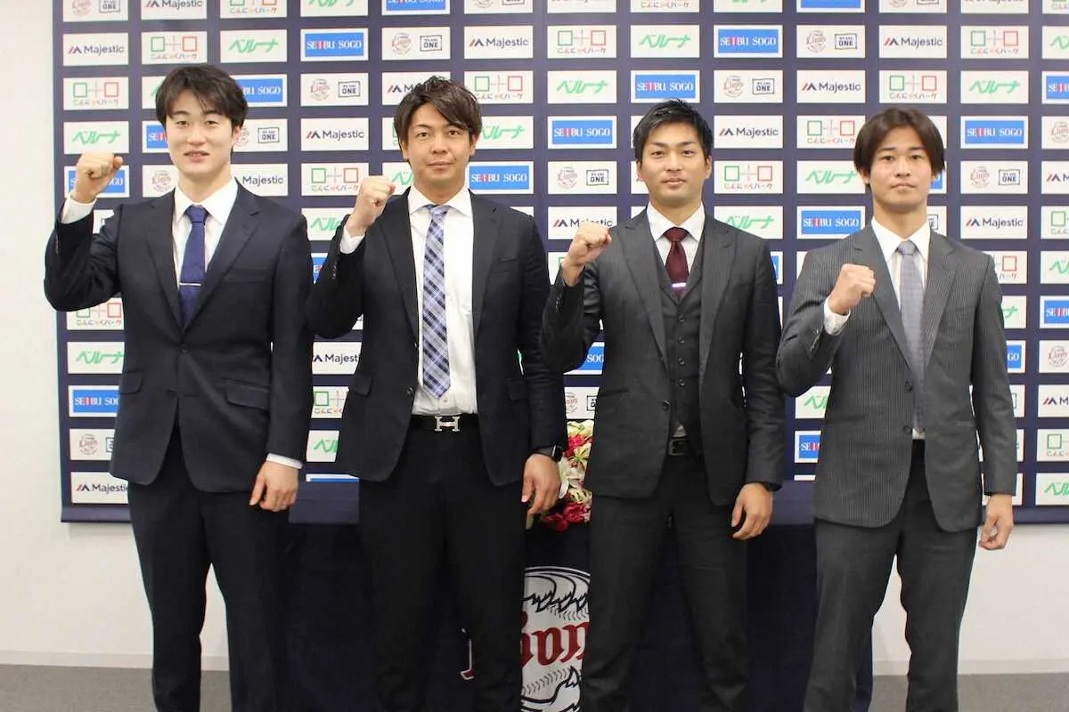 西武アカデミーのコーチに就任した(左から)戸川氏、白崎氏、田代氏、綱島氏