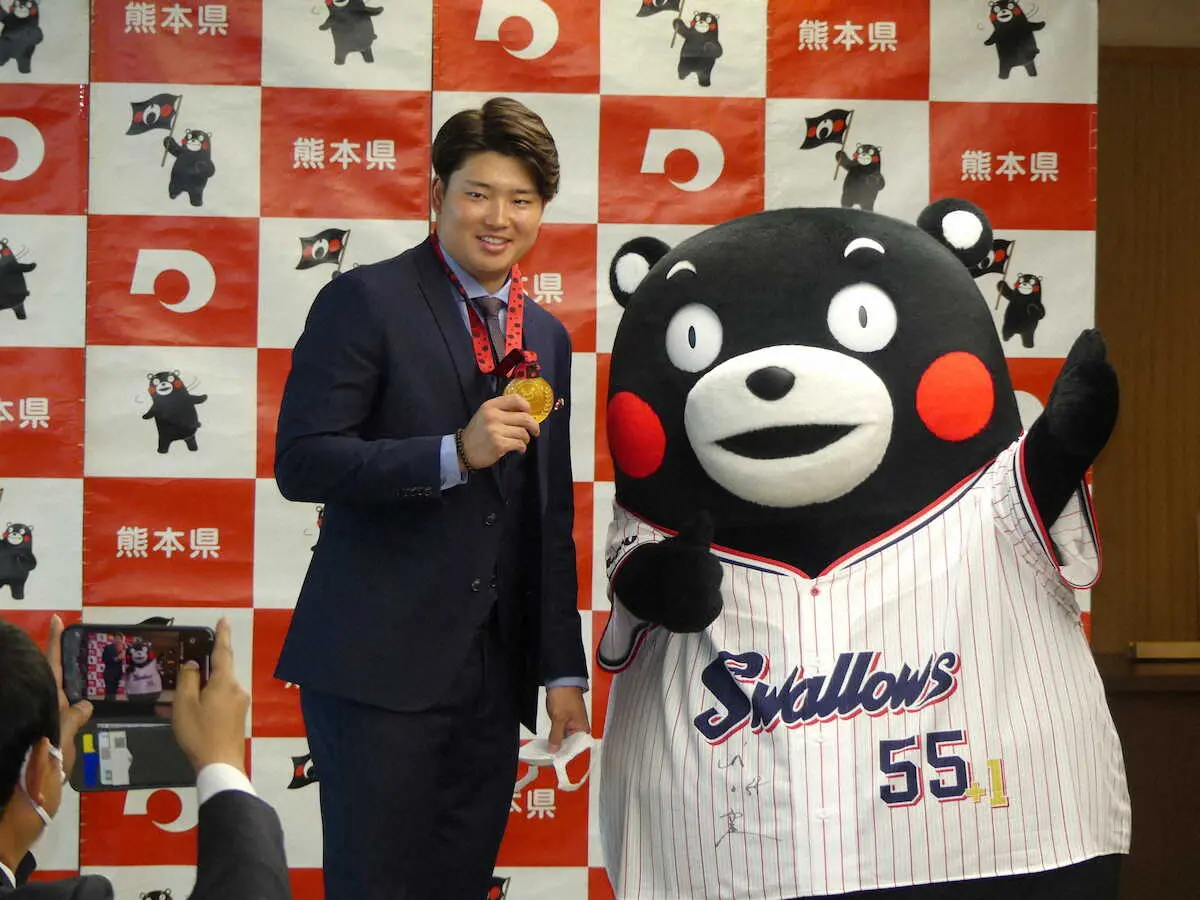 ヤクルト・村上が、故郷・熊本県の県庁で「熊本県民栄誉賞」の贈呈式に出席。「プロ野球が開催できるような新球場、施設、設備が整ったボールパークを造っていただきたい」と要望した。
