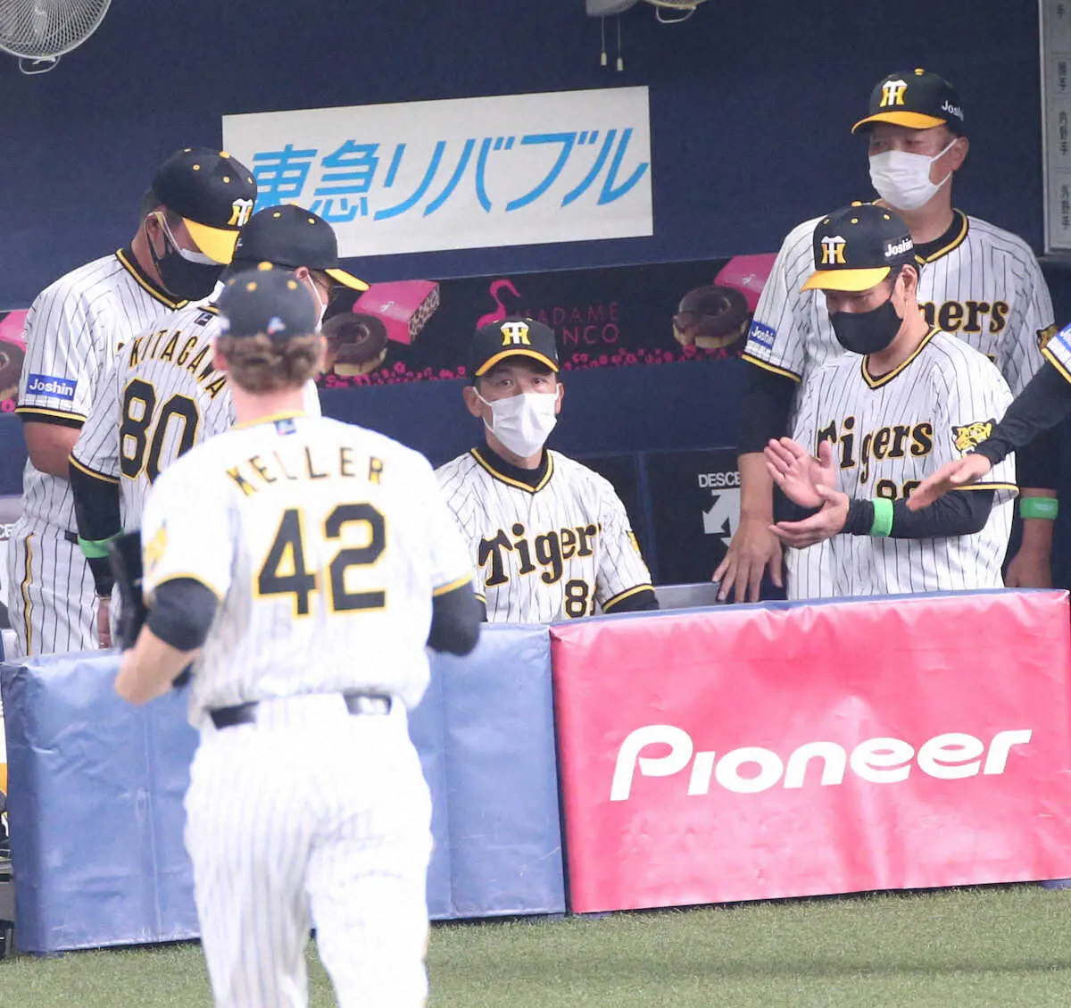開幕戦<神・ヤ1>ベンチに戻るカイル・ケラー(背番号42)を見つめる矢野監督(撮影・北條貴史)