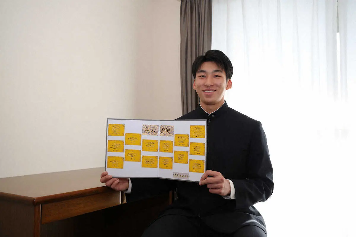 リトルシニアのチームメイトから貰った色紙を手に入寮する阪神ドラフト4位・茨木秀俊(球団提供)
