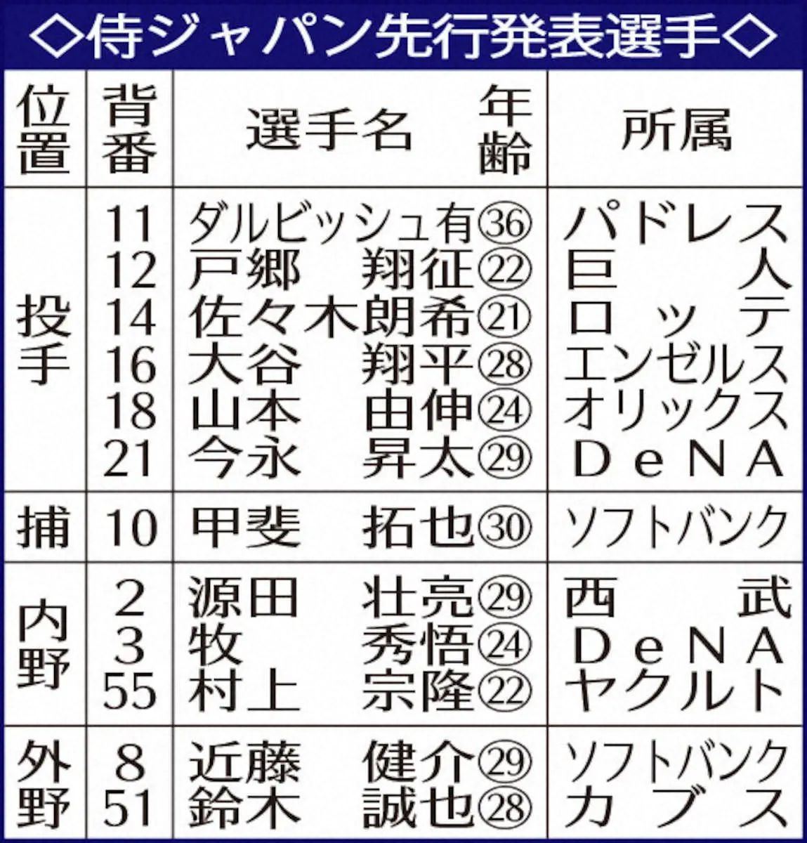 主なWBC侍ジャパン候補 Photo by スポニチ 楽天・マー君 ダルビッシュとWBC14年ぶり共闘熱望 契約更改では9億円か… ギャラリーで見る この記事のフォト 2023年01月08日の画像一覧 もっと見る 2023年01月08日の画像をもっと見る