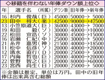 ≪史上2位の大幅減額≫田中将は20年オフにヤンキースから楽天に復帰。同年8億円で更改した菅野(巨)を上回るプロ野球歴代最高年俸の出来高払いを含む9億円で2年契約を結んだ。その総額9億円を基準にした4億2500万円減は、15年オフの杉内(巨)の4億5000万円減に次ぐ史上2番目の大幅減額となるが、球団は年俸ベースでは減額制限(1億円超は40%)を超えていないと説明した。田中将が4億7500万円で更改したことで、今季の日本選手最高年俸は山本(オ)の6億5000万円。田中将は浅村(楽)、菅野(巨)、山田(ヤ)の各5億円に次ぐ9位となった。