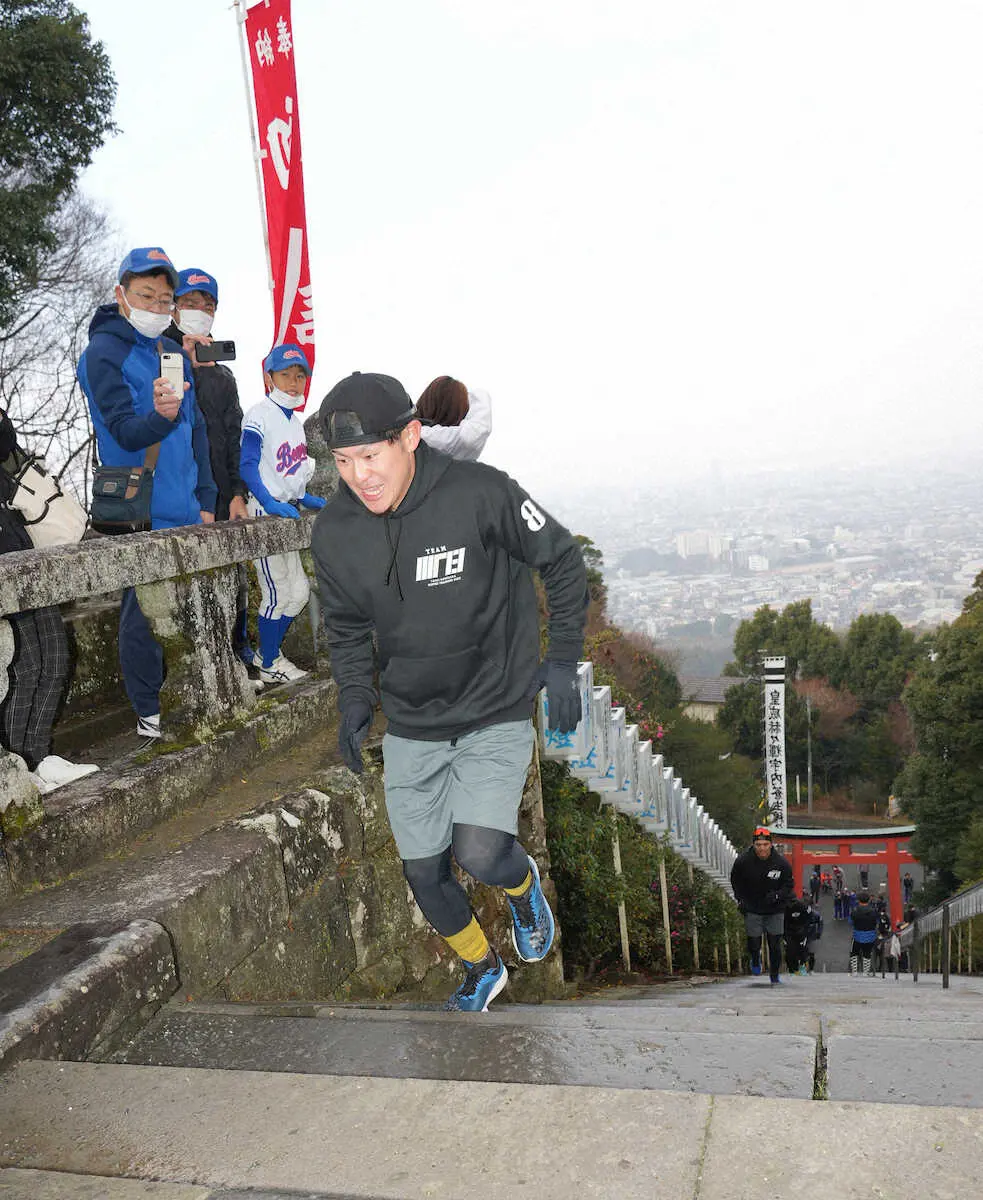 高良大社の階段を駆け上がるソフトバンク・牧原大(撮影・岡田 丈靖)