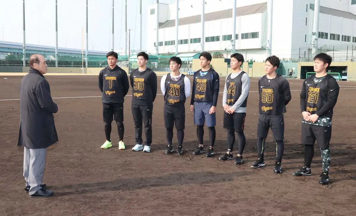 よう聞きや。阪神の新人合同自主トレが9日、鳴尾浜球場でスタート。視察に訪れた岡田監督が全選手を集めて訓示した。