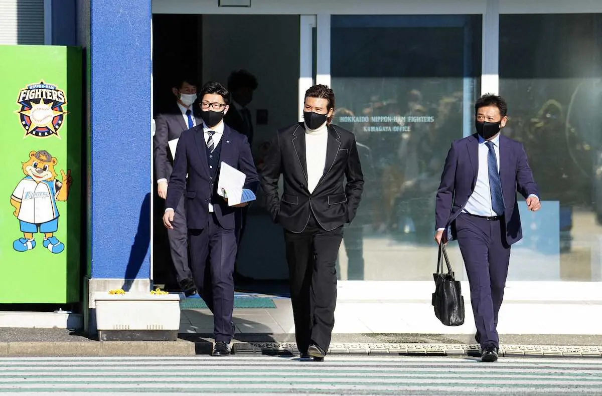 スタッフ会議を終えた日本ハムの新庄監督(中央)(撮影・長久保 豊)