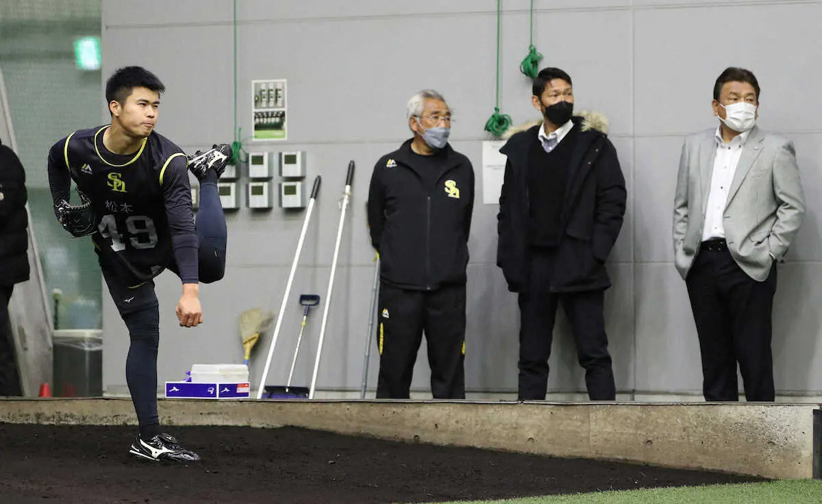 ソフトバンクのドラフト2位・大津亮介投手(23=日本製鉄鹿島)、同5位・松本晴投手(21=亜大)が15日、春季宮崎キャンプのA組入りをアピールした。この日、藤本博史監督(59)が福岡県筑後市のファーム施設で行われている新人合同自主トレを視察。森浩之ヘッドコーチ(56)、斉藤和巳投手コーチ(45)ら首脳陣も見守る中、ブルペン投球で順調な調整ぶりを示した。