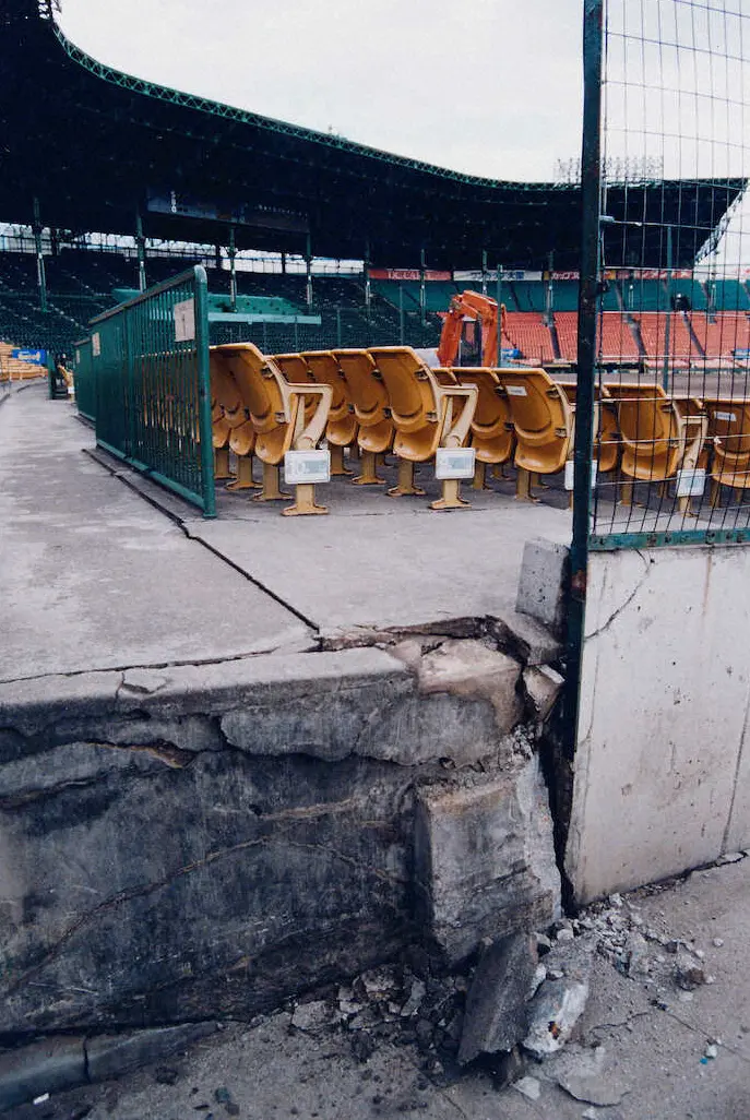 甲子園球場の一塁側内野席ではコンクリートが崩れていた
