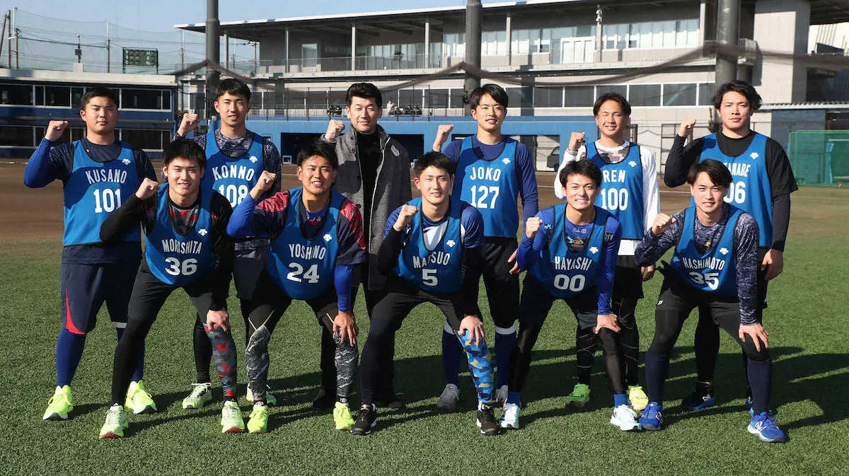 記念撮影するDeNAの(前列左から)森下瑠大、吉野光樹、松尾汐恩、林琢真、橋本達弥(後列左から)草野陽斗、今野瑠斗、三浦大輔監督、上甲凌大、鈴木蓮、渡辺明貴