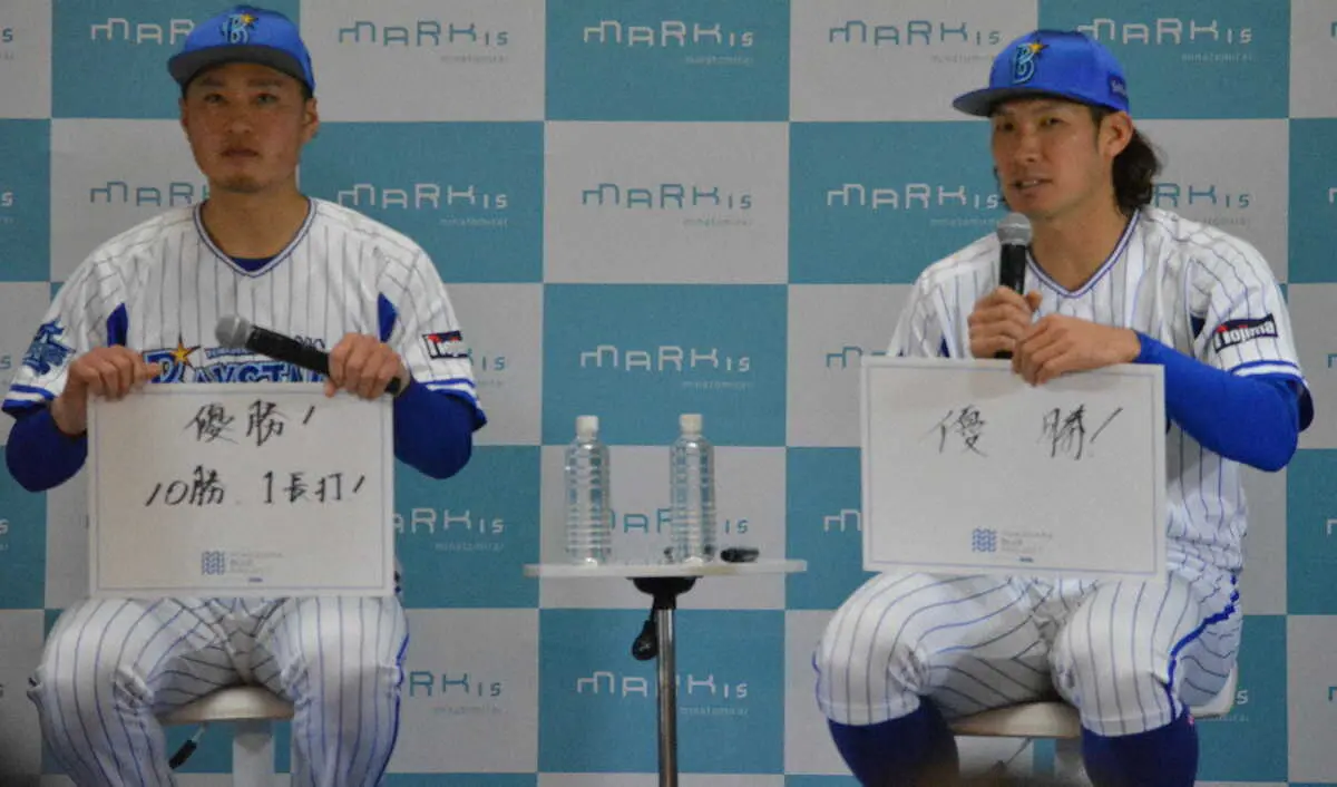 みなとみらい地区でトークショーに参加し目標を掲げるDeNA石田(左)&大田