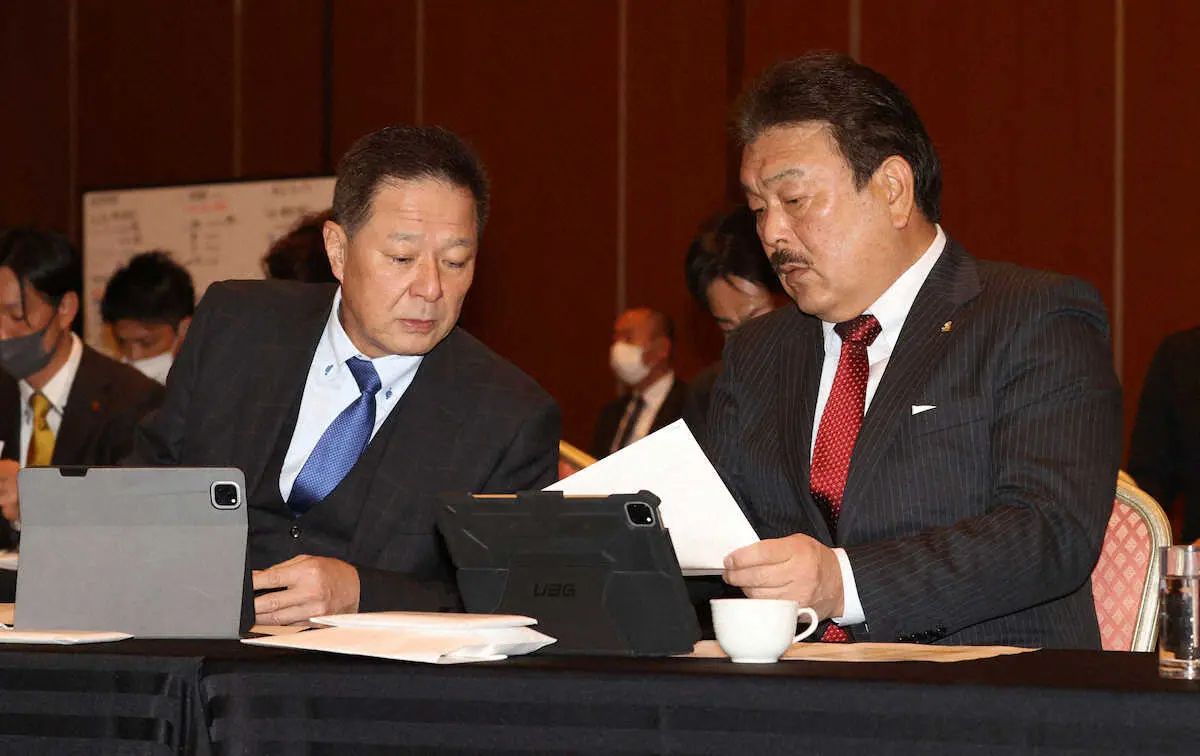 <ソフトバンク監督・コーチ会議>森ヘッドコーチ(左)と話す藤本監督