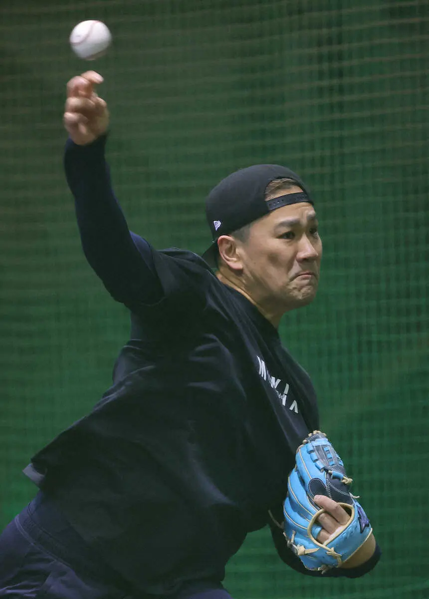 楽天・田中将大投手が25日、楽天モバイルパーク室内のブルペンで改造中の投球フォームで投球練習を行った。立った受け手に5球のウォーミングアップを行った後に、セットポジションから直球のみ、座った捕手へ11球投げた。