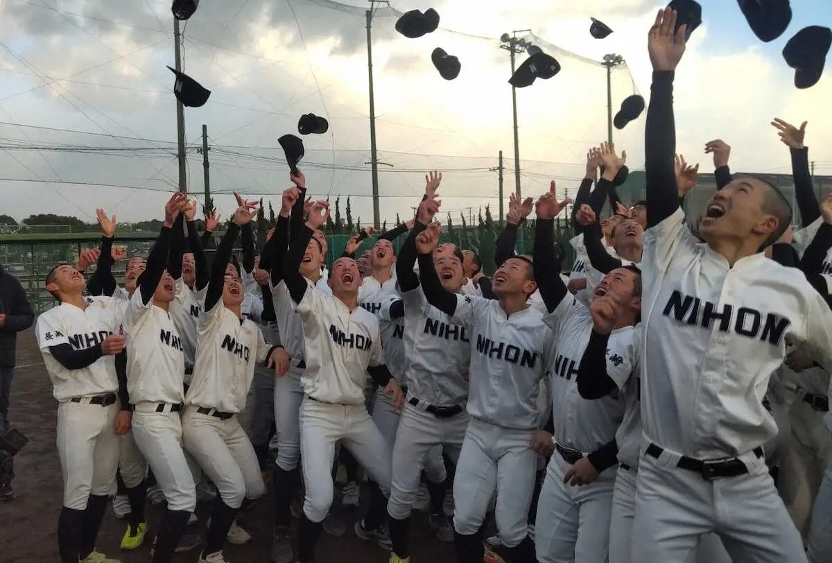 2年連続のセンバツ出場を決めた長崎日大ナインは小雪が舞う長崎の空に向け喜びの帽子投げを行った。昨秋は公式戦のチーム打率・348の打線と西尾海純、広田樹大の2人の投手陣の活躍で九州大会で準優勝した。
