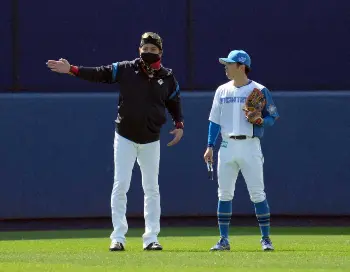 日本ハムは1日、沖縄・名護で春季キャンプをスタート。初日から、懐かしいシーンが実現した。紅白戦開始前、外野の中堅の位置に新庄監督、左翼に森本外野守備走塁コーチ、右翼に稲葉GMが入り、それぞれの位置を守る選手に対して、細かくアドバイスを送った。