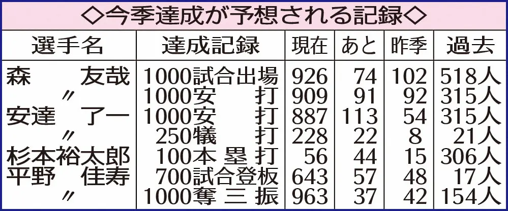 FA移籍の森は通算1000安打にあと91本。西武時代の9シーズンのうち100安打以上が5度あり、今季中の達成に期待がかかる。19年には打率・329で捕手として4人目となる首位打者を獲得。捕手で2度首位打者になればプロ野球初の快挙だ。また、守備位置に関係なく2球団で首位打者は江藤慎一(中2度、ロ1度)、内川聖一(横浜、ソ各1度)が両リーグにまたがって記録。森が手にすれば、史上3人目で、同一リーグ2球団では初めてになる。チームの捕手でシーズン打率3割以上は44年阪田清春(・310)、82年中沢伸二(・302)と2人。捕手の球団最高打率更新も目標にしたい。