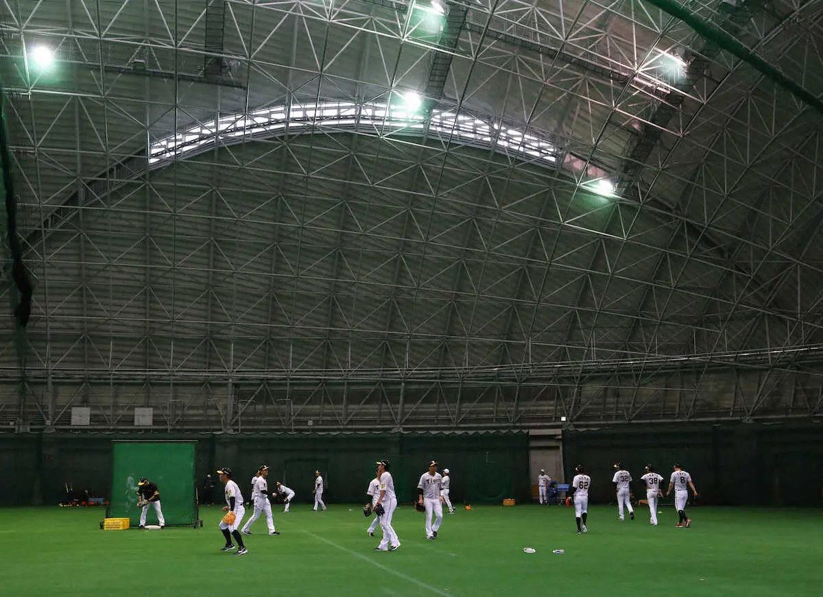 宜野座ドームでノックを受ける阪神ナイン(撮影・後藤 大輝)