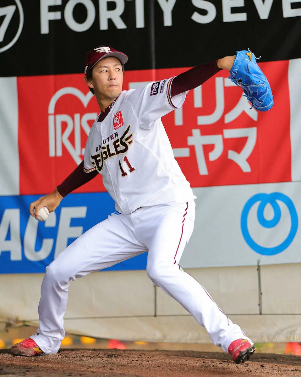 38歳でチーム最年長の楽天・岸が初めてユニホーム姿で本格的な投球練習を行い、78球を投げ込んだ。