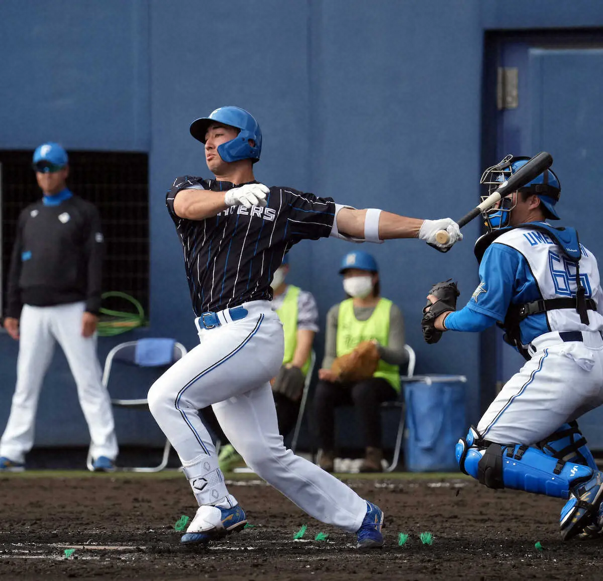 守備でも9回1死一塁で、右翼後方に上がった飛球に背走し、フェンスに激突しながら好捕した。新庄監督は「もっと(実戦に)慣れてほしい」としつつも、「強いゴロを打てる打者は使っていきたい。続けていったら結果が出てくる。すぐ(支配下の背番号)2桁になるんじゃない」と背番号127の可能性の塊を高く評価した。