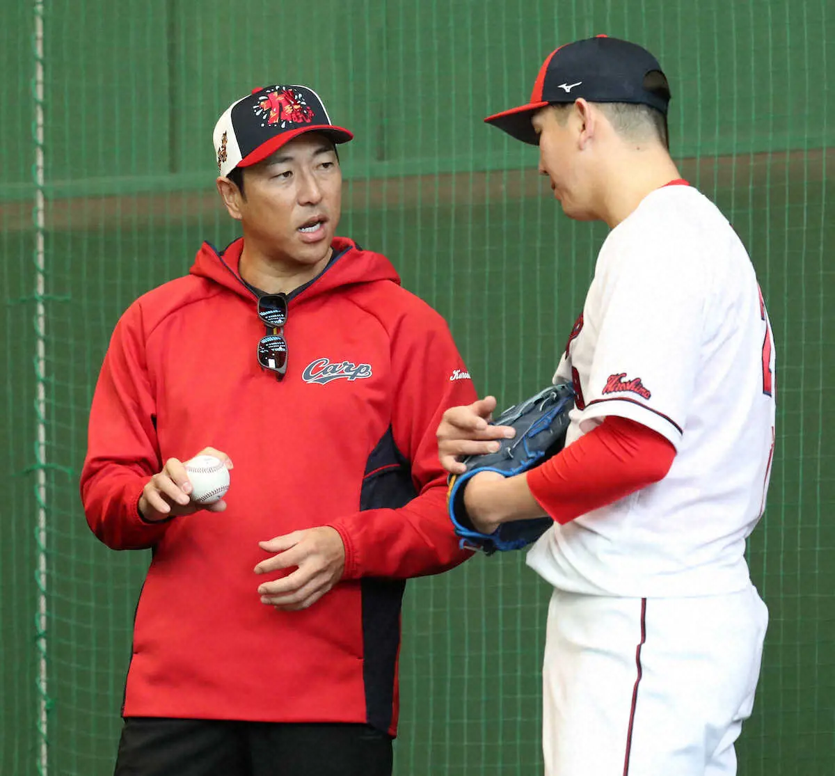 右足関節骨折からの復活を目指す床田には「行けるやん!」と励ました。新人の益田、長谷部に対しては持っている球種を確認したうえでカウントが悪くなったときの変化球の使い方について意見交換。ケムナにはチェンジアップの握り方をレクチャーすると、2年目右腕・松本にも熱視線を送った。その間、約80分。さまざまな角度からアプローチして、練習を見守った。