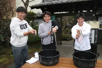 日南市の観光体験では宮崎県が養殖生産量全国3位のうなぎのつかみ取り体験も行った。ヌルヌルしたうなぎをつかむのに苦戦した河野は「野球でも悪戦苦闘する場面があると思うが、開幕1軍をつかみ取りたい!」と意気込み、その後、うな重を堪能して英気を養った。「うなぎはおいしかった。明日から練習をしっかりやっていきたい」と益田。前日5日には黒田球団アドバイザーからツーシームを伝授してもらったと明かし、「やっていこうと思う」と習得に意欲を示した。