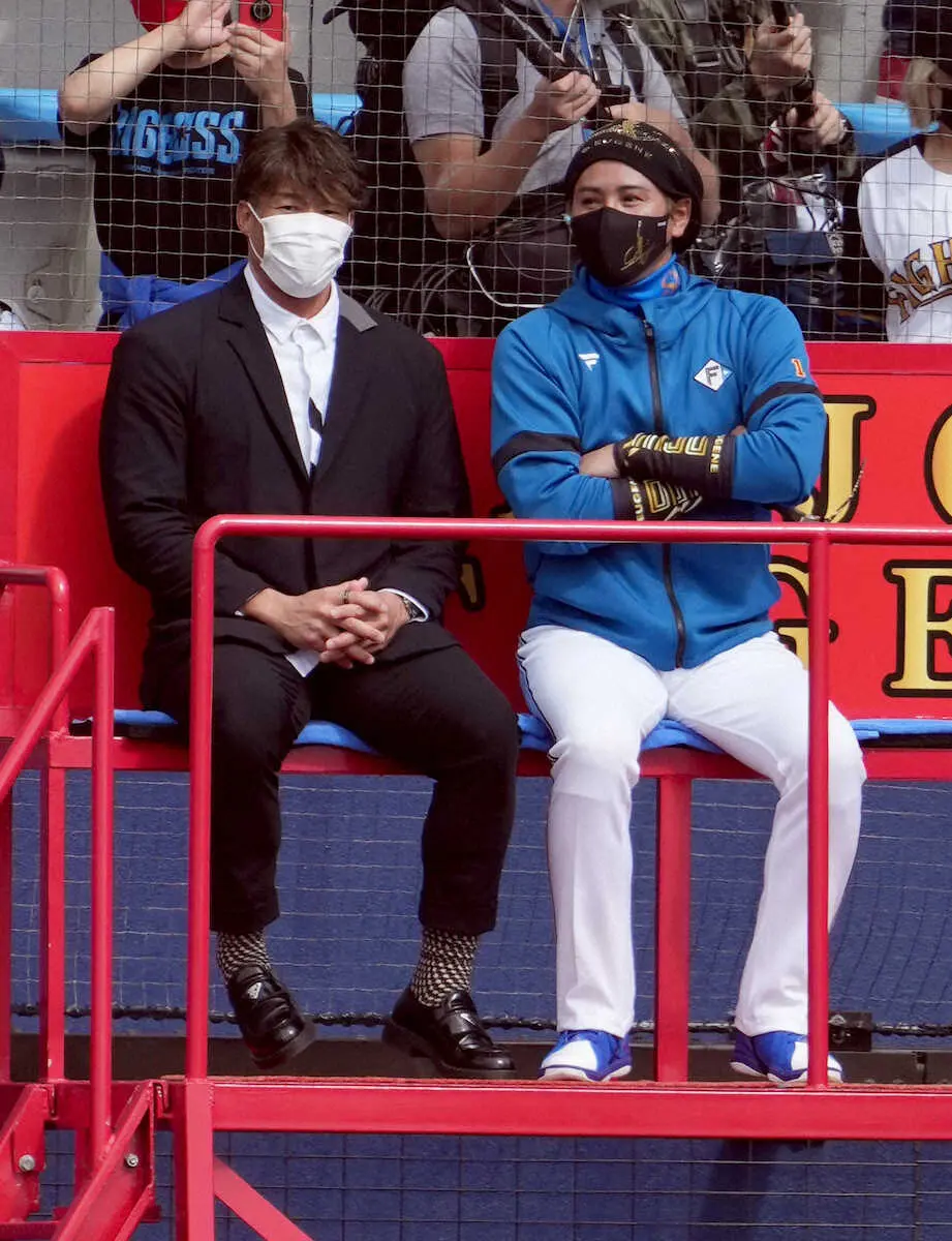 新庄ステージで新庄監督と練習を見る糸井氏(左)(撮影・高橋 茂夫)