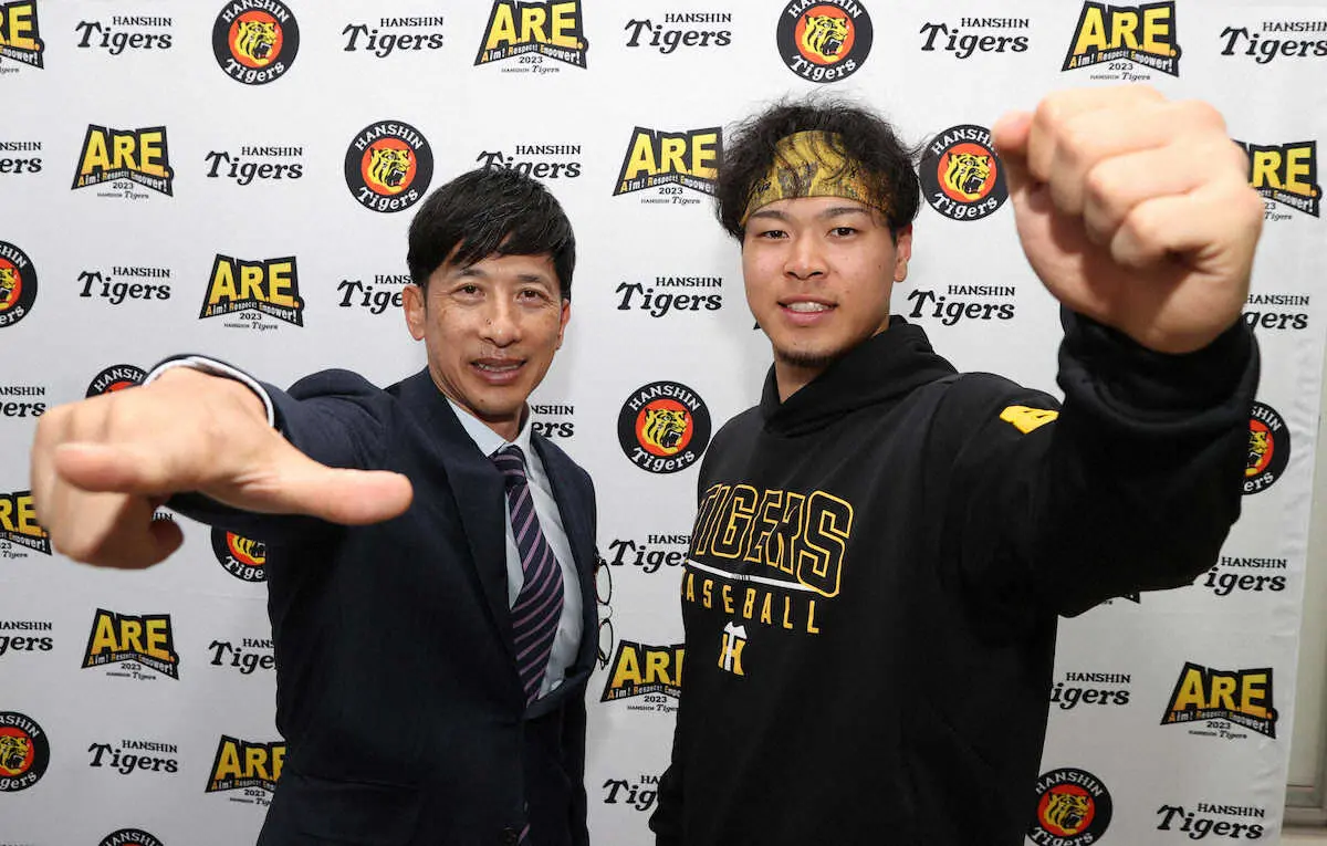 「矢野ガッツ」を決める佐藤輝(右)と「Zポーズ」の矢野燿大氏(撮影・大森 寛明)