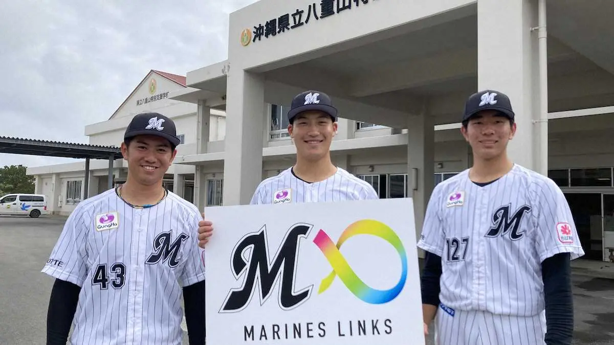 八重山特別支援学校を訪問した(左から)ロッテの秋山正雲、菊地吏玖、吉川悠斗(球団提供)
