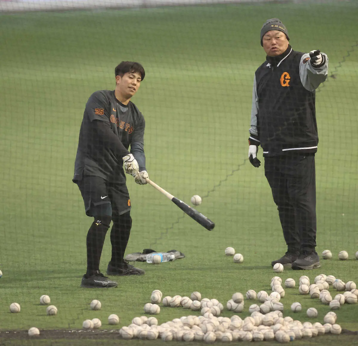<巨人 宮崎キャンプ>アーリーワークで打ち込む門脇(左)と大久保コーチ (撮影・西川祐介)