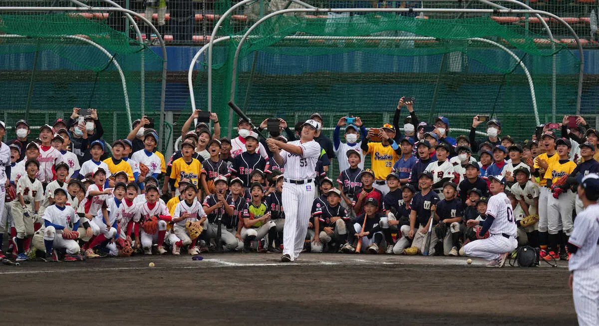 浦添市内の14チーム約120人が参加。打撃実演で「むーらかっみ!」コールが起こると、バットを持って打席へ。3球目を捉えると右翼席に消えた。続くボールも快音を響かせ2連発。子供たちの憧れの「村神様」が見事に期待に応えた。