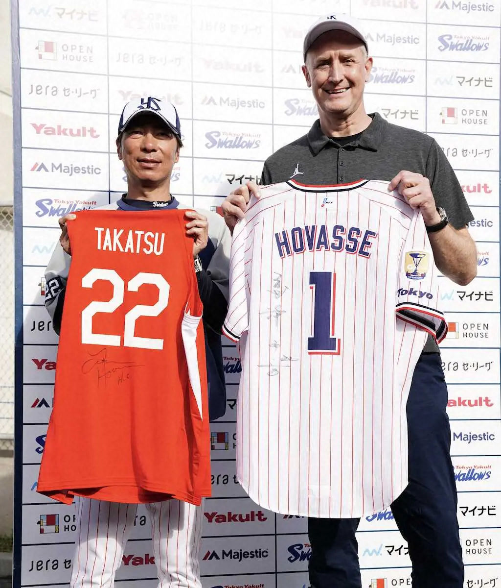 恩師に野村イズム継承を誓った直後には、8月に沖縄でW杯が開催されるバスケットボール男子日本代表のトム・ホーバス監督(56)と初対面。ユニホームを交換し、キャッチボールで交流した。