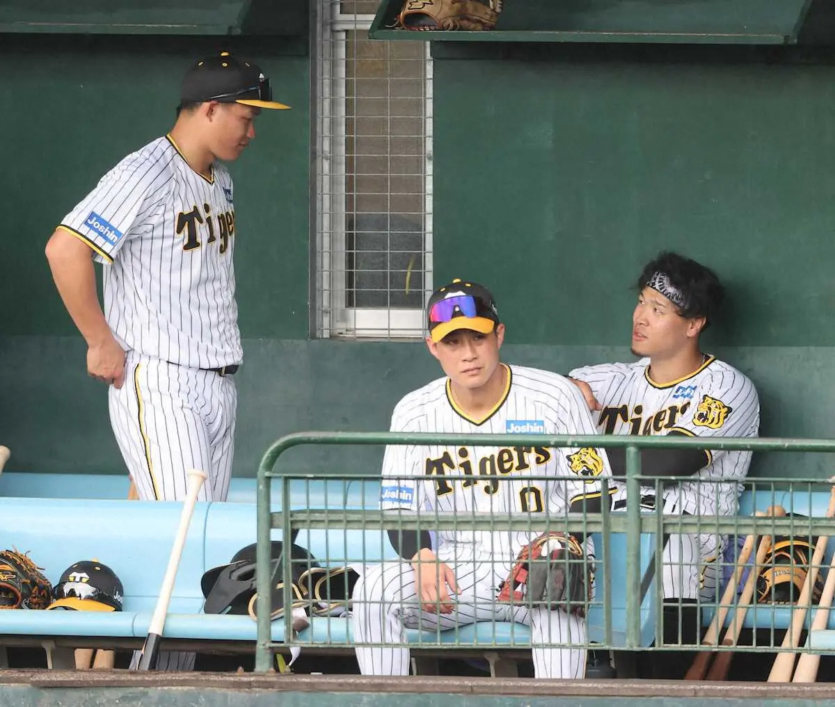 阪神の佐藤輝と森下が12日の紅白戦を前に、ベンチ内でコミュニケーションを取った。