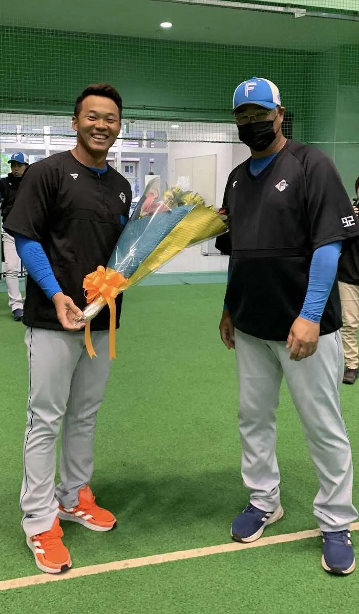 日本ハム・王柏融に木田2軍監督が激励の花束 台湾代表でWBC出場「台湾のことも応援して」