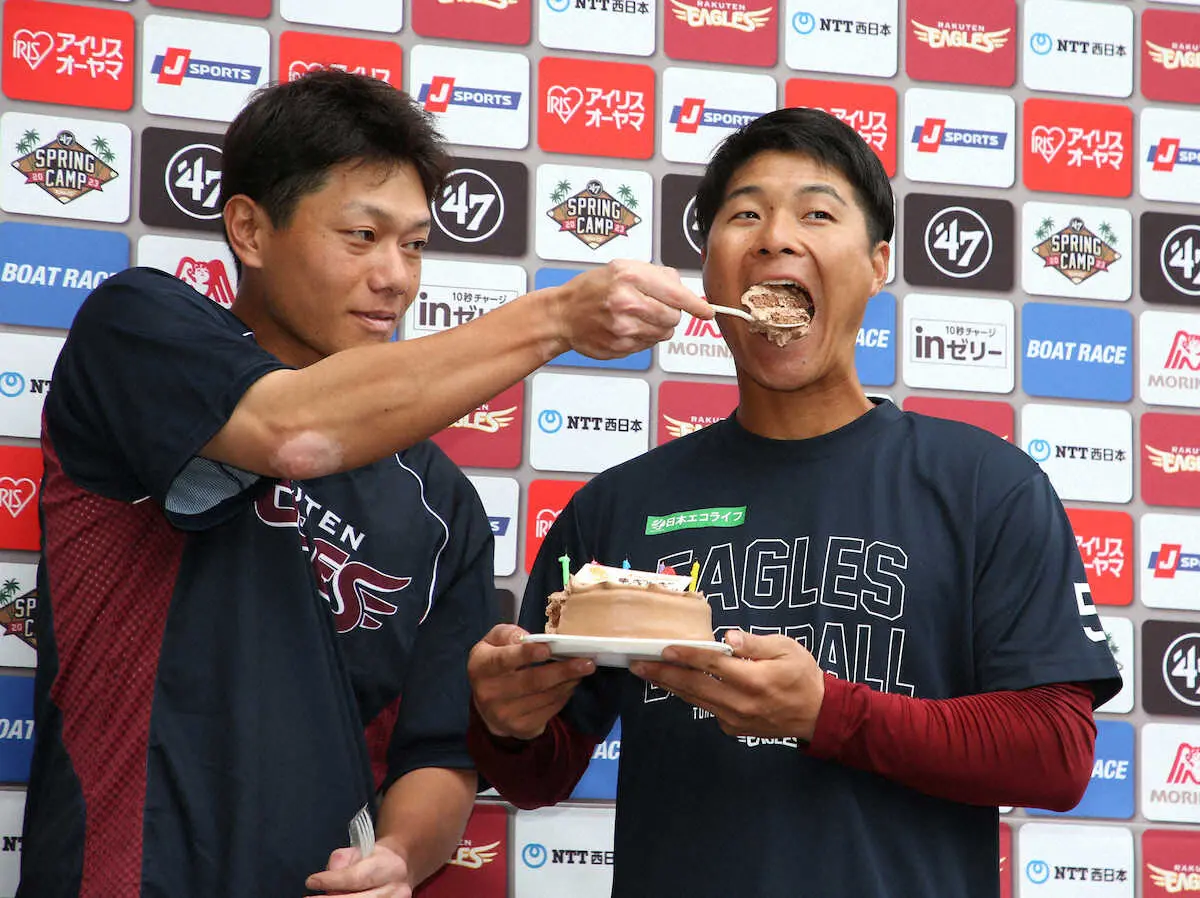 バレンタインデーが誕生日の楽天・茂木に、29歳を祝うバースデーケーキを田中和が強引に口に運んだ。