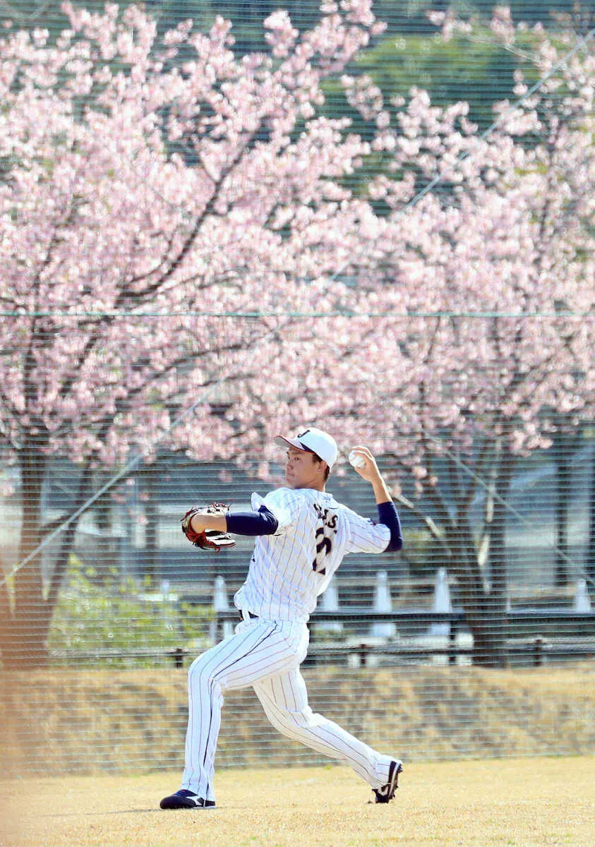 河津桜を背にキャッチボールする湯浅(撮影・尾崎 有希)