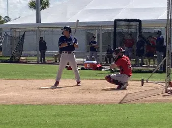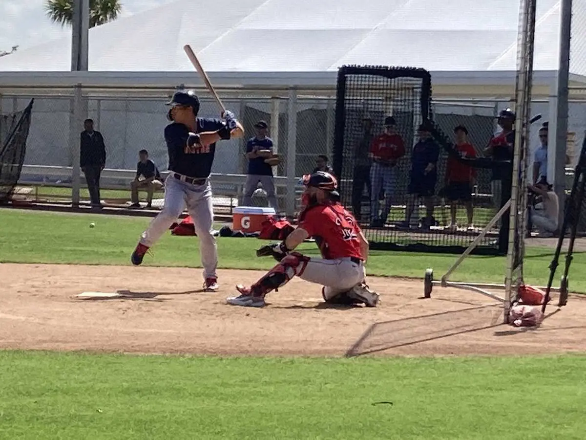 その後、初めてライブBP(試合形式の打撃練習)に臨み、過去サイ・ヤング賞2度の大ベテラン、コリー・クルーバー投手と対戦。第1打席ではクルーバーの5球目、86マイルの変化球を奇麗に右前に弾き返した。第2打席は2球目を打ってまたも右前にヒット性の打球。第3打席は4球目を見た時点でクルーバーの球数が規定に達したか、そこで打ち切りになったが、全11球の中で打撃の上手さと選球眼の両方を披露した。