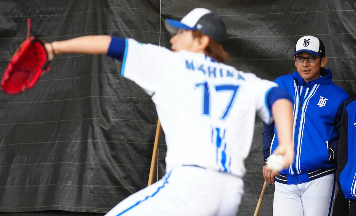 ブルペンで投球練習する三嶋(左)を見る三浦監督(撮影・島崎忠彦)