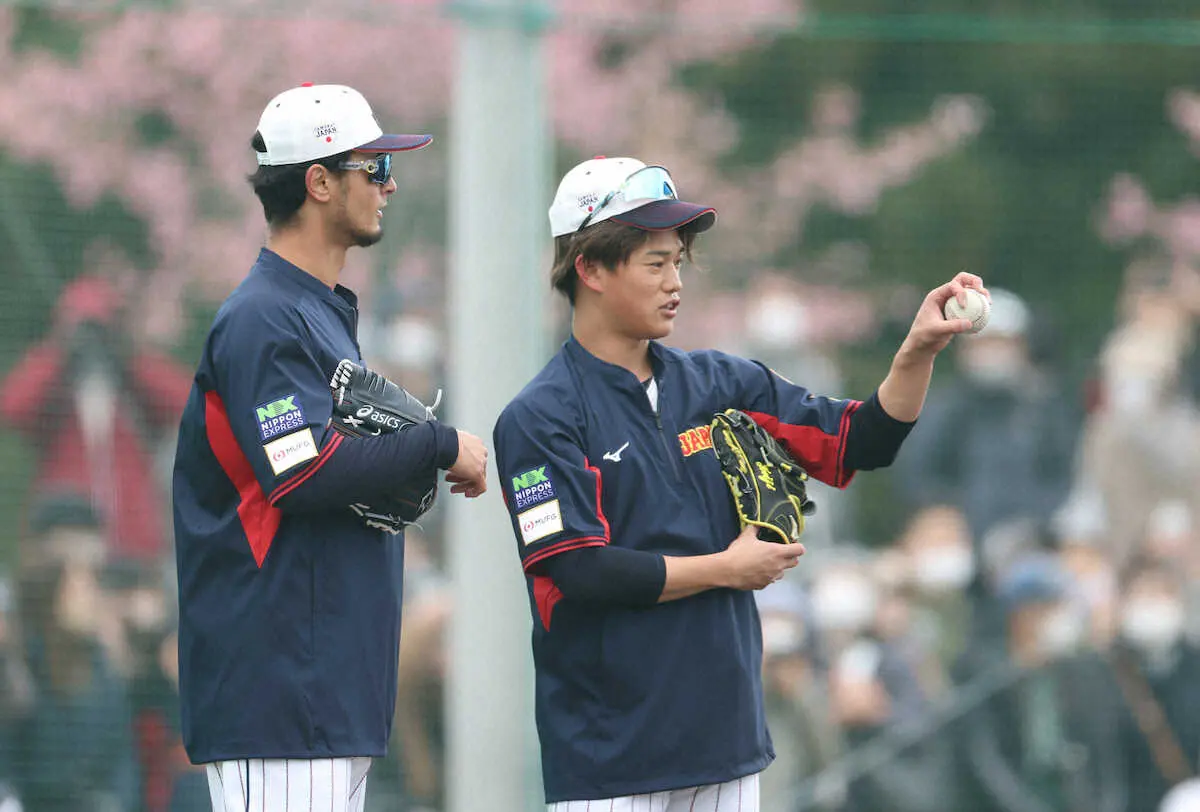 高橋奎二投手(25=ヤクルト)とダルビッシュ有投手(36=パドレス)がそれぞれ変化球の握りを教え合っているシーンがあった。