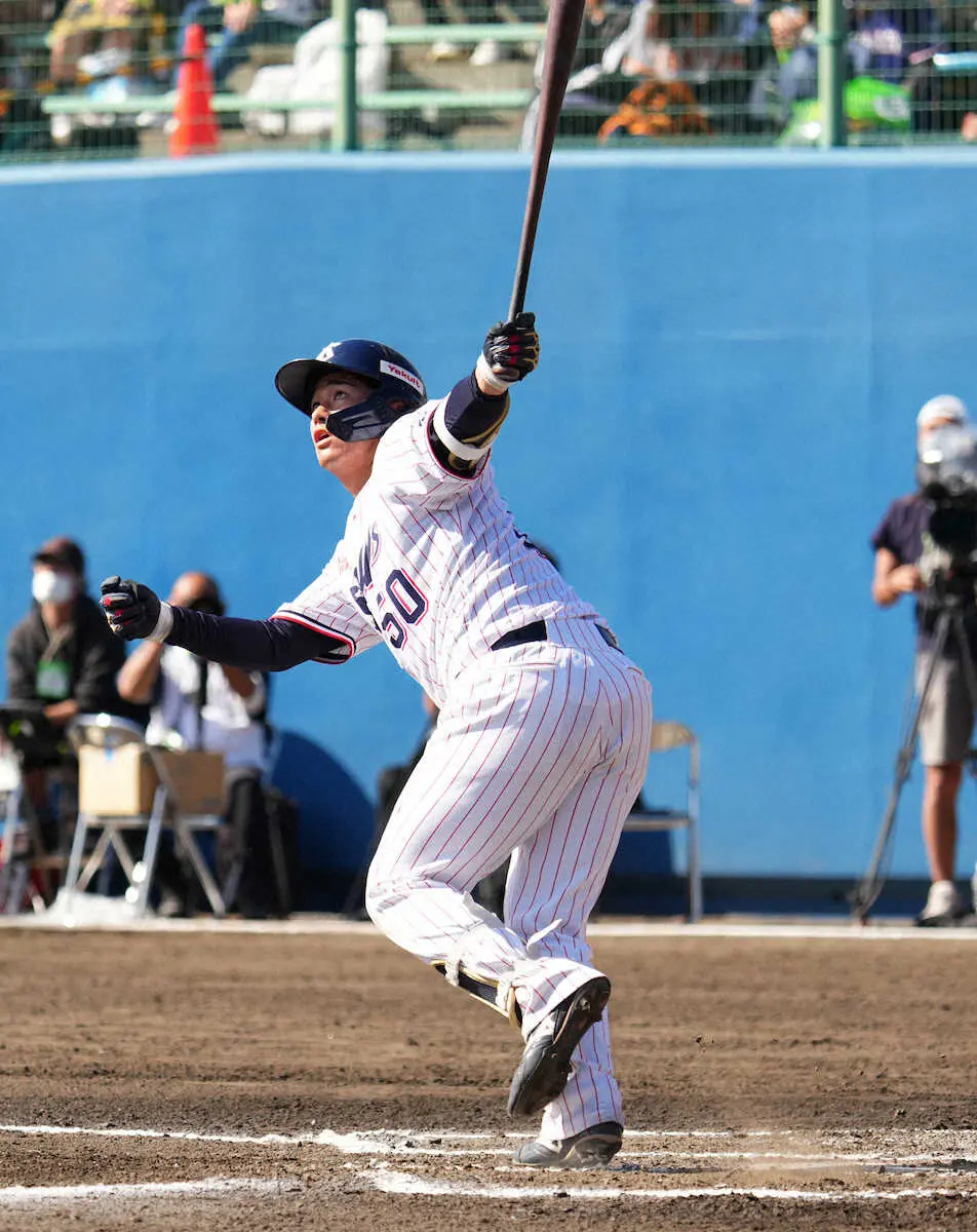 ヤクルトのドラフト5位・北村恵吾内野手(中大)が23日、巨人とのオープン戦(浦添)で実戦初アーチを放った。