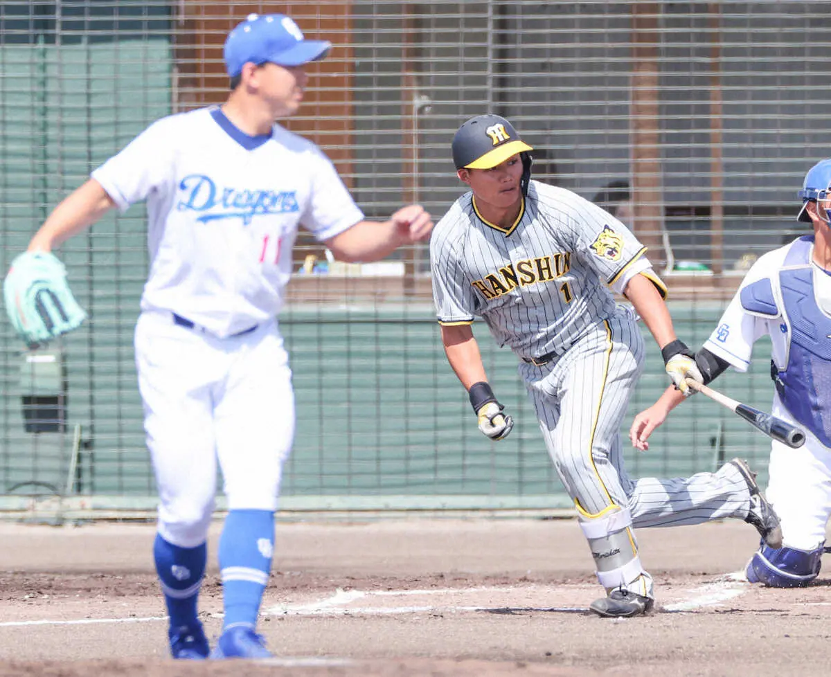 <中・神>2回、東海大相模の先輩でもある中日・小笠原(左)との“初対戦”で適時二塁打を放った森下(撮影・岸 良祐)