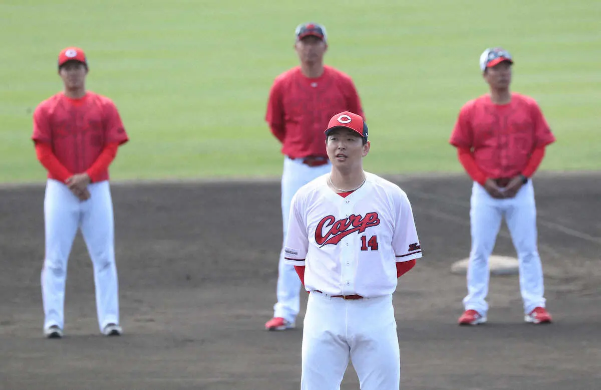 キャンプを終えあいさつする選手会長の広島・大瀬良(後方中央は新井監督) (撮影・奥 調)
