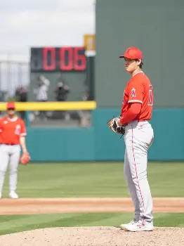 オープン戦<アスレチックス・エンゼルス>藤浪(右から2人目)が見つめる中、力投する大谷(撮影・光山 貴大)