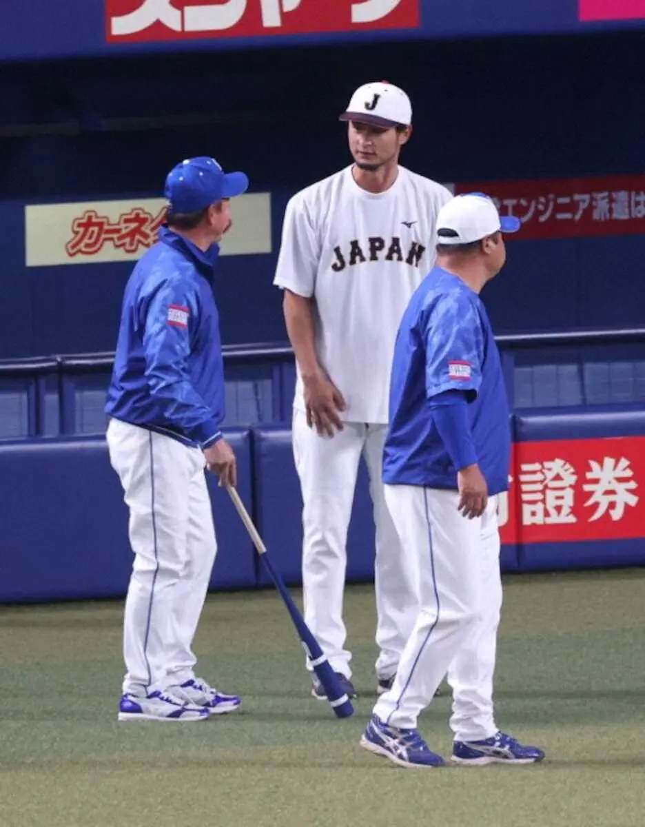 壮行試合<中・侍>立浪監督(左)に謝罪へ向かうダルビッシュ(中央)(撮影・平嶋 理子)