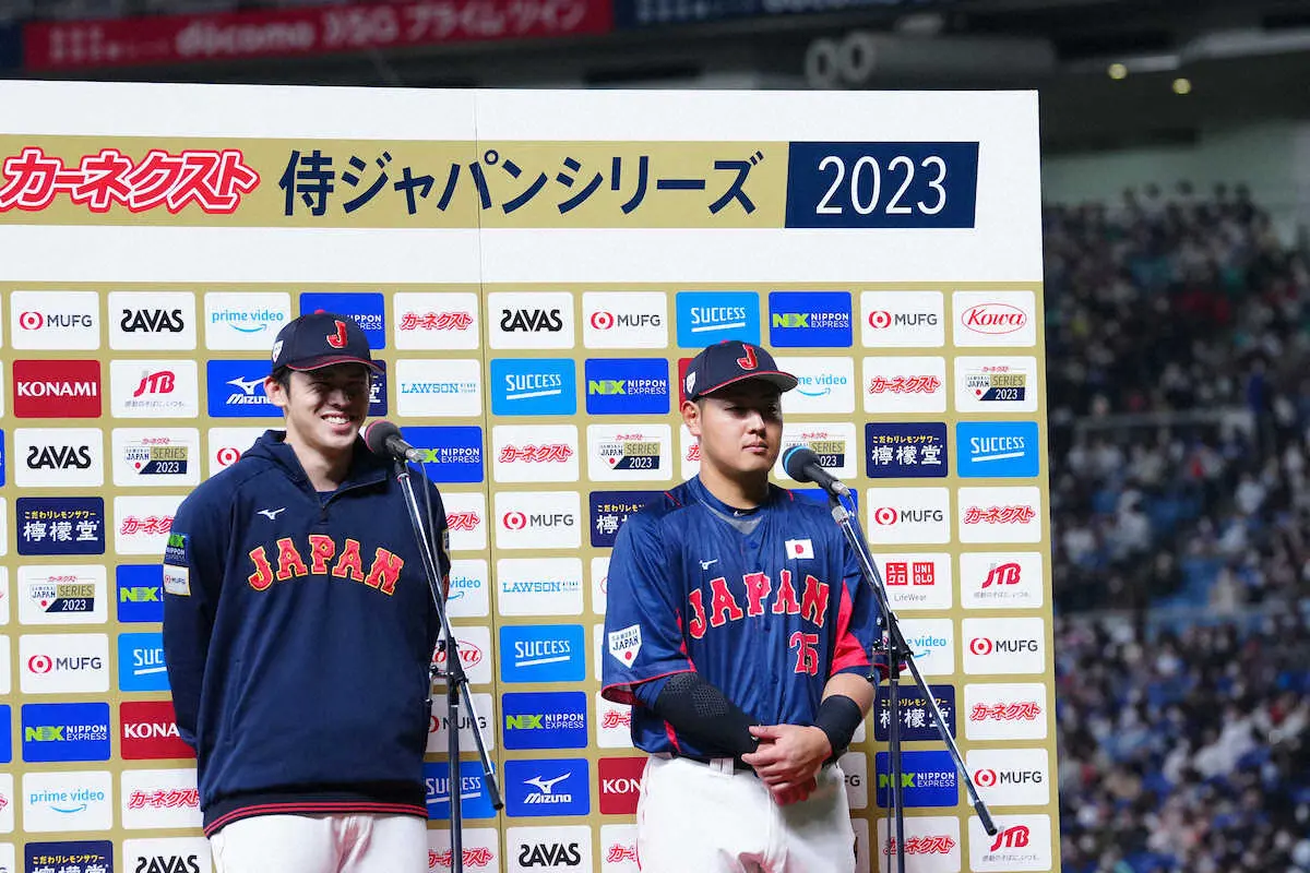 試合後のお立ち台では佐々木朗希が「師匠もたくさん打ってくれると思うので、応援よろしくお願いします」と岡本和を“師匠”呼びする一幕もあった。2月の強化合宿で村上が「初めて会った時から師匠って呼んでる」とリスペクトして呼んだことから付いた“愛称”だったが、岡本和は「アイツはなめてるんすよ」と苦笑い。「呼んでるのも朗希と宮城大弥やとムネぐらいで。なめてる3人」と話し、報道陣の笑いを誘った。