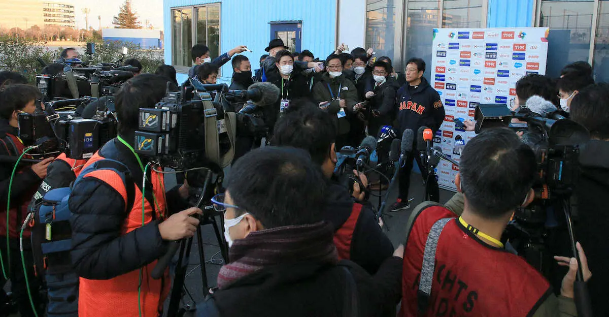 <侍ジャパン練習>大勢の報道陣に囲まれる栗山監督(撮影・尾崎 有希)